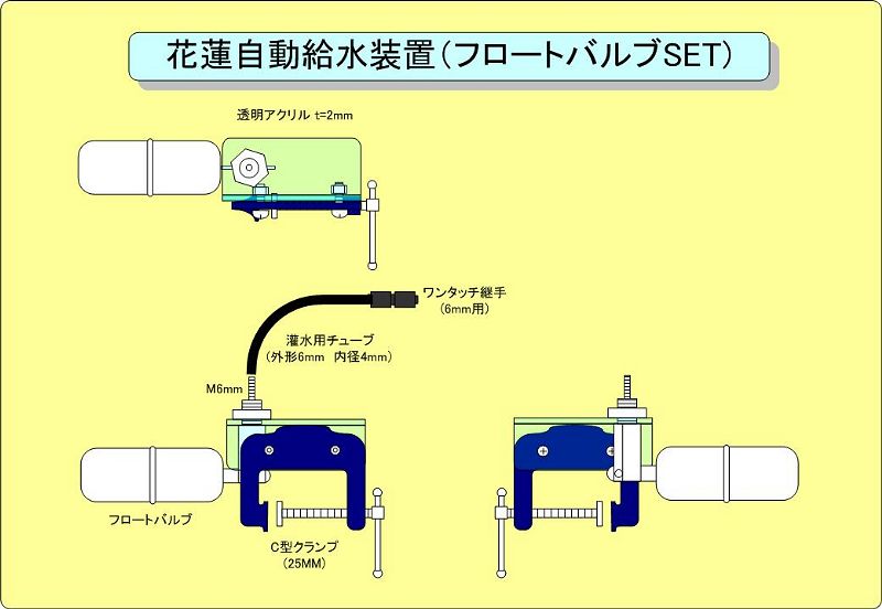 また、水鉢に固定するのに安価なC型クランプを使用していましたが材質が鉄だった為に、屋外使用では1シーズンで錆びてしまいました。今後は錆びないSUSのクランプに変更する予定です。 |