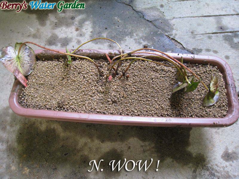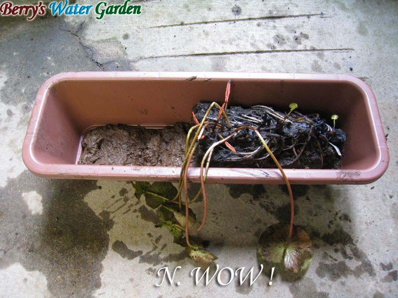 温帯スイレンの植え付けには5号や7号の浅鉢を使用します。これは睡蓮の栽培=「睡蓮鉢を使う」というところから来たのだと思いますが、 最近の品種は根茎が伸びる大型種が多く、10号鉢が必要な品種も少なくありません。WOW!等は根茎が60cm程度にならないと花が咲きにくいというレポートも出ています。 温帯睡蓮の栽培方法は、1年に1回春先に根茎を掘り出して全ての根を取り除いて10cm程度にカットし植え付けるものと信じ込んでいましたが最近その方法に疑問を感じるようになりました。 栽培に睡蓮鉢を使わないのであればプランターなどの角形容器の方が栽培には適していると思うのです。 Berry's Water Gardenでは育てている温帯睡蓮に大型種が多いこともあり、ほとんどの温帯種は角形のキングタライで栽培しています。 この角形の容器の場合は、丸鉢より角形のプランターの方が収まりが良く、現在はほとんどの温帯種の容器をプランターに切り替えています。 また、植え替えの時期なのですが春の植え替え時に既に花芽を持っている睡蓮も多く花芽ができる春先に根茎を切り分けて植え替えするとその後の成長がしばらく止まってしまいせっかくで出した花芽もダメになってしまいます。植え替えると必ず花芽は朽ちてしまいます。 それと、せっかく1年かけて育った根茎や根をを切ってしまうのもスイレンにとっては大きなストレスになっているのではと考えていました。 スイレンを毎年植え替える理由は鉢という限られた空間で栽培する為に、株が成長してはみ出したり古い根や根茎が残っていて新しい根が伸びるスペースが足りなくなったりして花上がりが悪くなるからです。 自然環境では植え替えすることなく毎年成長して花を咲かせています。自然環境のように毎年植替えない栽培法があればよいのですが限られた水鉢の環境では難しいのが現状です。 そこでプランター栽培だからこそできる栽培方法を以前から考えていました。その方法が下記の根茎と根をできるだけ温存して植え替える方法です。 プランターの根鉢ごと切ってしまうので取り除いた分新しい栽培スペースが確保できます。根は残したままなので植え替え後の立ち上がりも良いのではないかと思っています。 また、植え替え時期も翌年の春ではなく前年中にしたほうが春のスタートも良いのではないかと思っています。 Berry's Water Gardenではこの冬(2009年)にこの新しい植え替え方法を試してみることにしました。植え替えは11月半ばから末ごろにする予定です。 |
