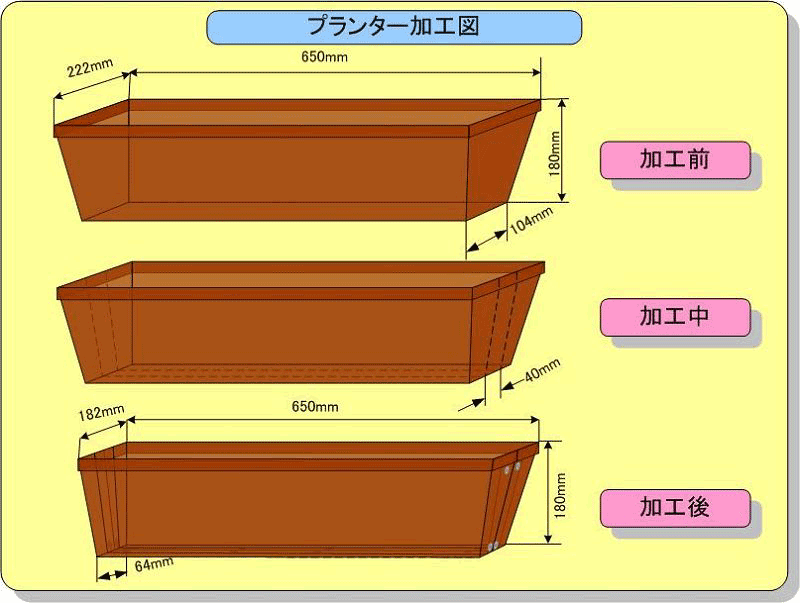 | 内容 | プランターの加工図面です。65cmプランターは4cm分をカットします。35cmプランターは3cm分をカットします。 |