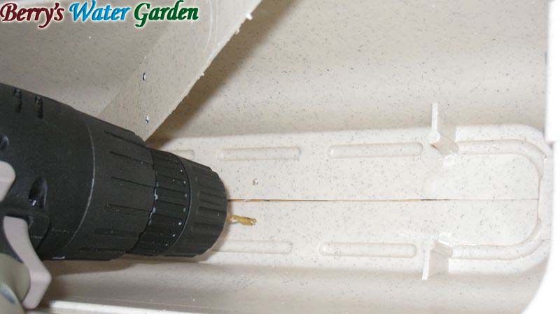最後に残った底部両側を接合します。接合剤の切り合わせ部は長い方で短い方を押さえるように重ねて接合します。ここでもマークせず直接ドリルで穴を開けてリベット止めをします。 |