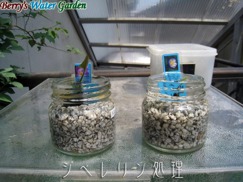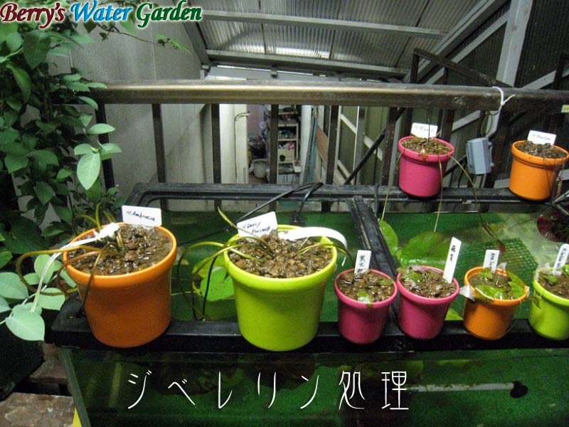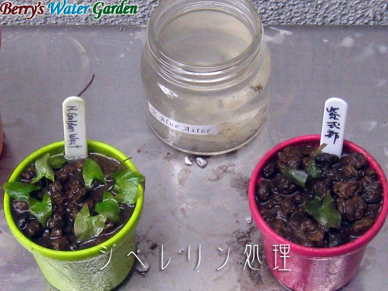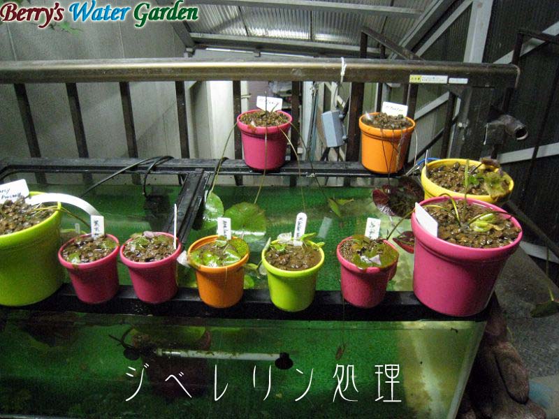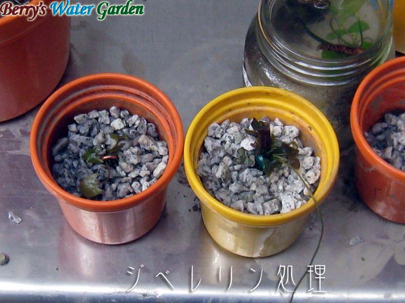 | 内容 | 上記熱帯スイレン篇で使ったジベレリン溶液の残りを、らんちゅう水槽組に投与、鉢を水から出して株元に50ppmのジベレリン溶液を縁いっぱいになるまで注ぎました。 |